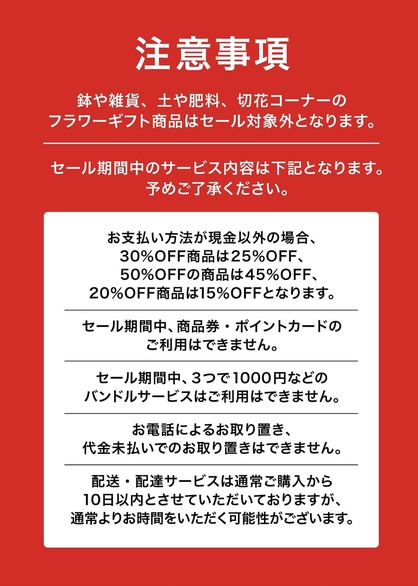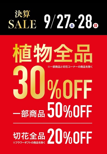 2025年09月27日(土) お知らせ SUPER SALE FUKUOKA EFFECT SUPER SALE!! 9月27日(土)、9月28(日)の二日間 創立以来初のSALEを開催します‼️ なんと 植物全品30%OFF 切花全品20%OFF 一部商品50%OFF ※一部商品を除く ※切花フラワーギフトは含まれません ”植欲の秋” 欲しかった高額アイテムもこの機会なら手が届く?! このチャンスを是非ご了承ください 皆さまのご来店を 心よりお待ちしております!